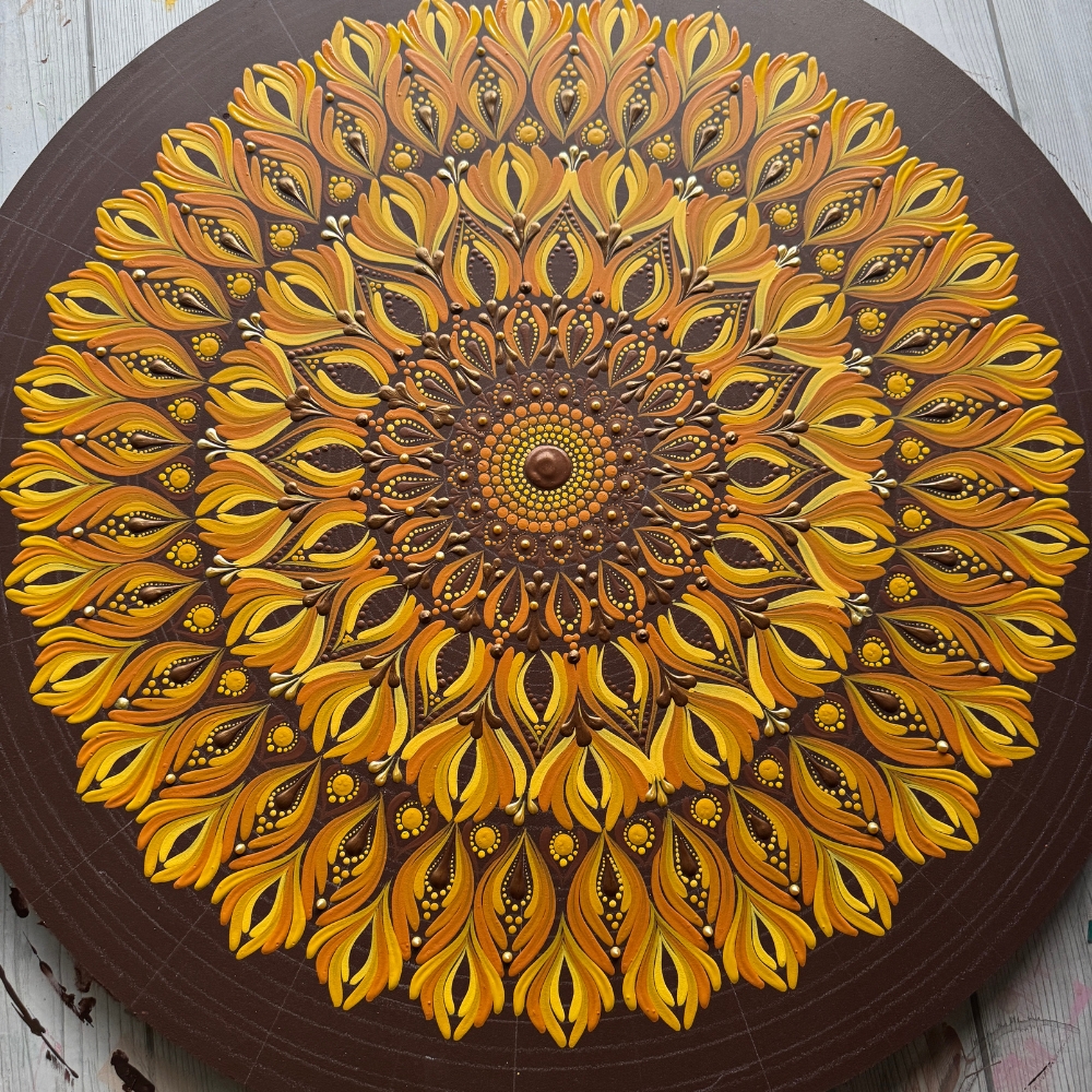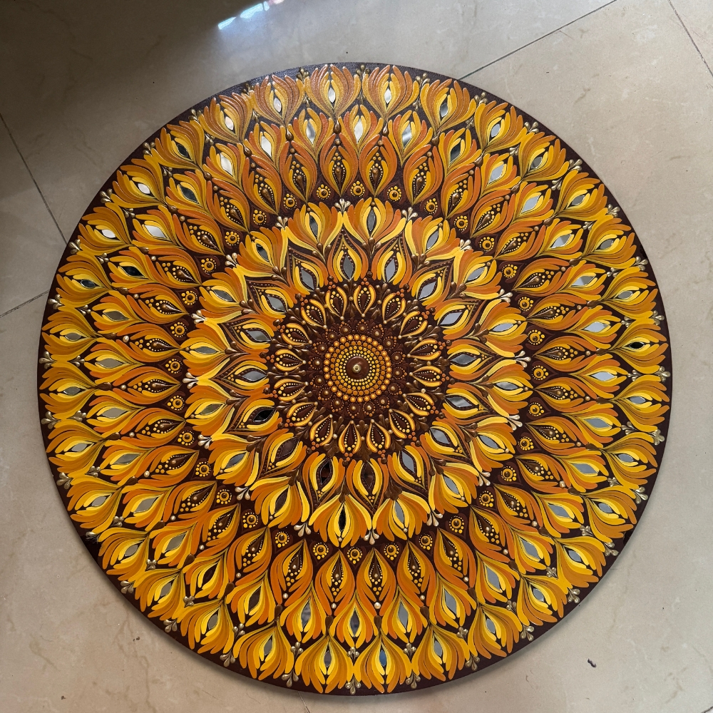Golden Bloom is a 22-inch mandala inspired by the radiant charm of sunflowers—symbols of warmth, happiness, and growth. Custom-created for a client in Canada, this piece captures the uplifting energy of golden petals reaching for the sun, infusing any space with vibrant positivity.