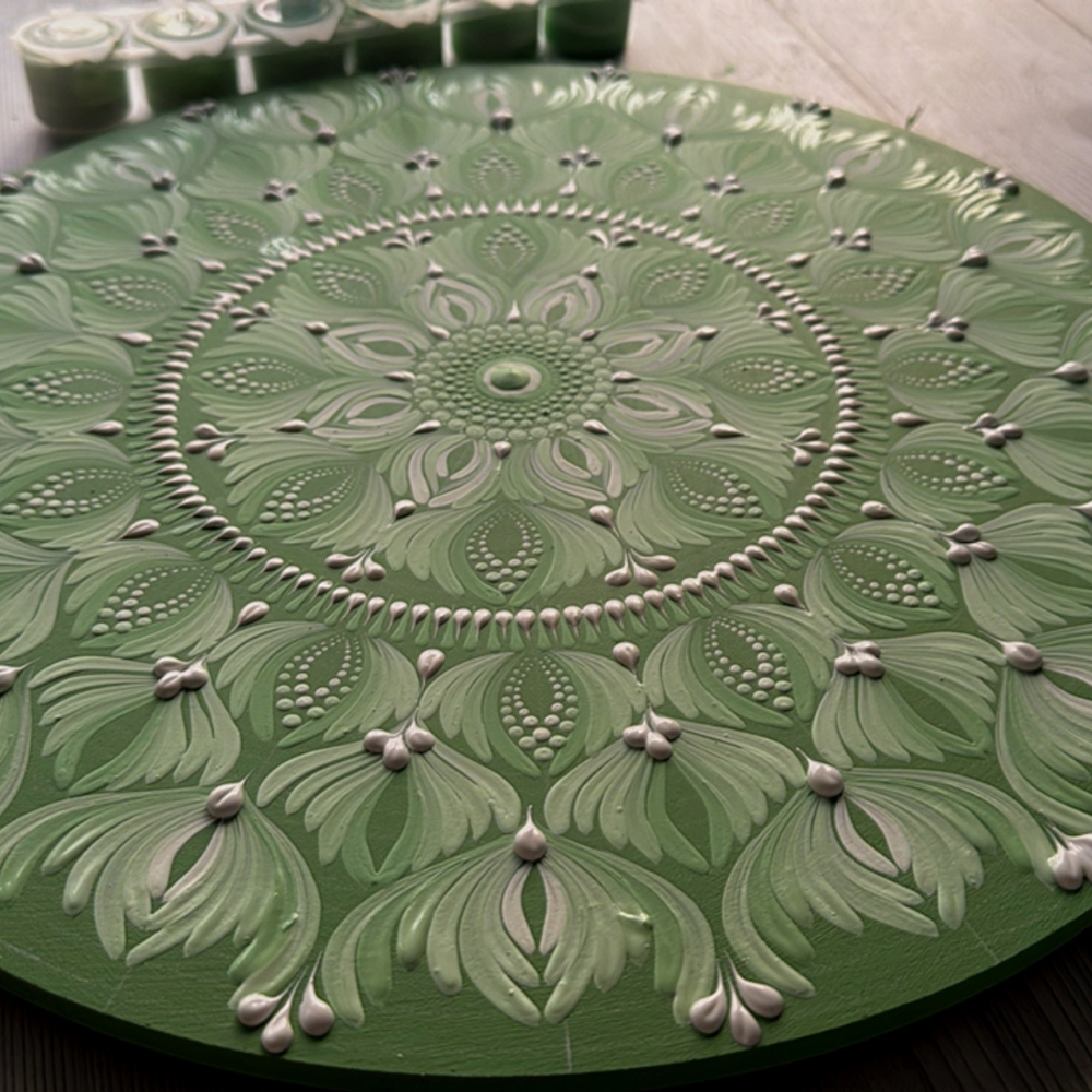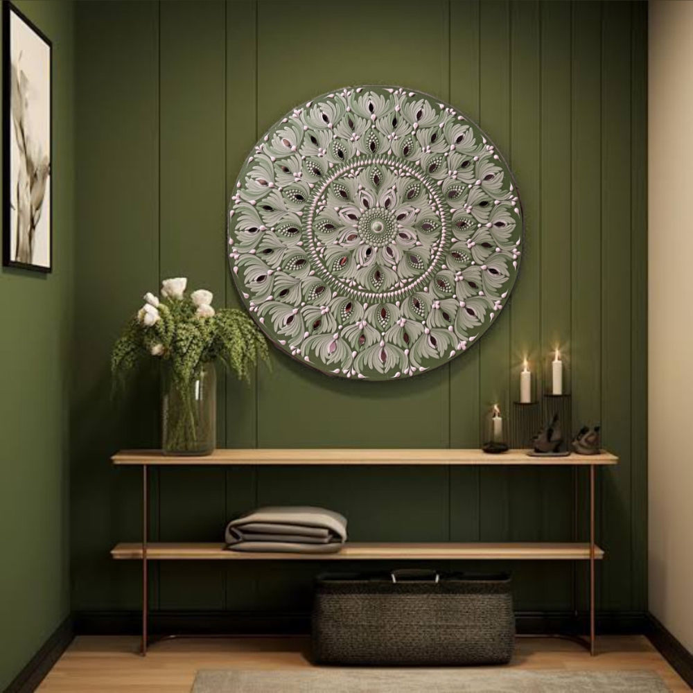 Minted Serenity is a 25-inch mandala painted in a serene palette of pastel greens, designed to bring peace, clarity, and balance to your space. Originally commissioned for a client in Canada, this piece is a quiet tribute to stillness—inviting deep breaths and a grounded state of mind.